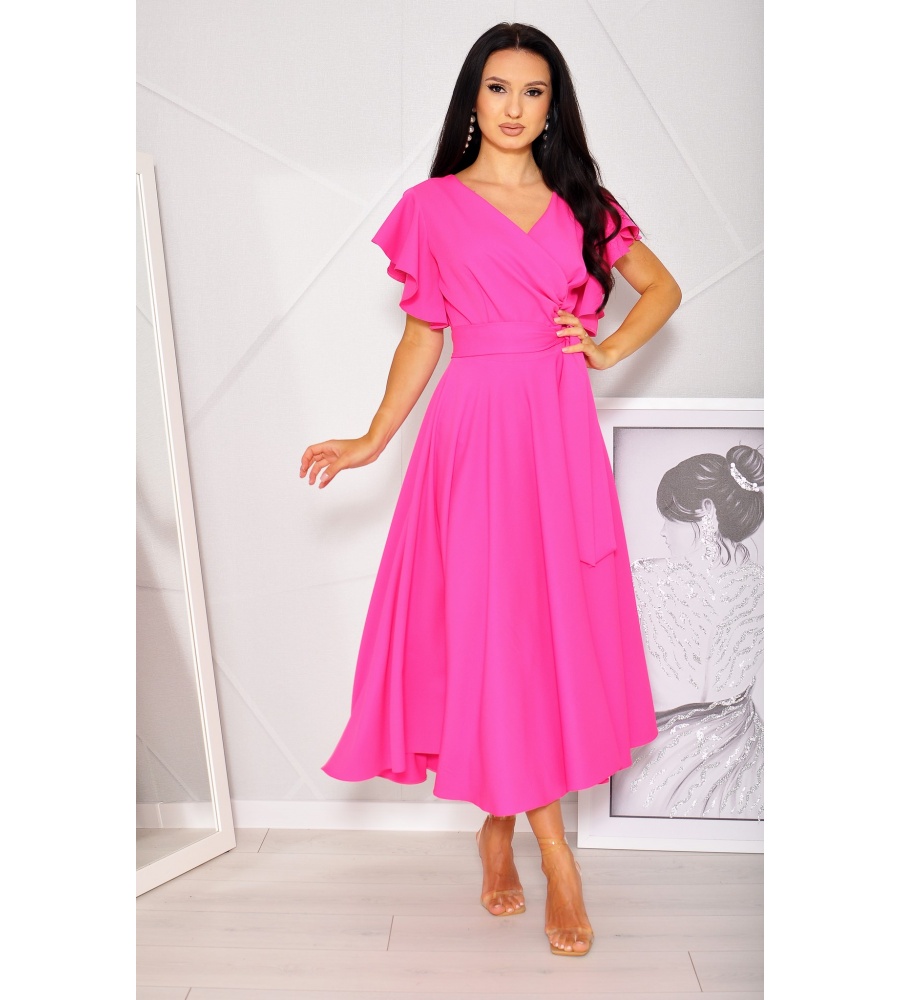 Delikatna sukienka o długości midi z dekoltem w literkę V. Model posiada delikatne falbanki przy rękawach oraz zwiewny dół. Wykonana z dobrej jakości nieprześwitującego materiału. Eksponuje i uwydatnia biust, sprawiając że sukienka prezentuje się subtelnie i zmysłowo.Taka długość pozwoli Ci poczuć się komfortowo niezależnie od sytuacji.