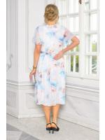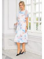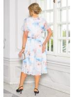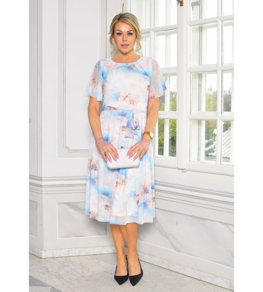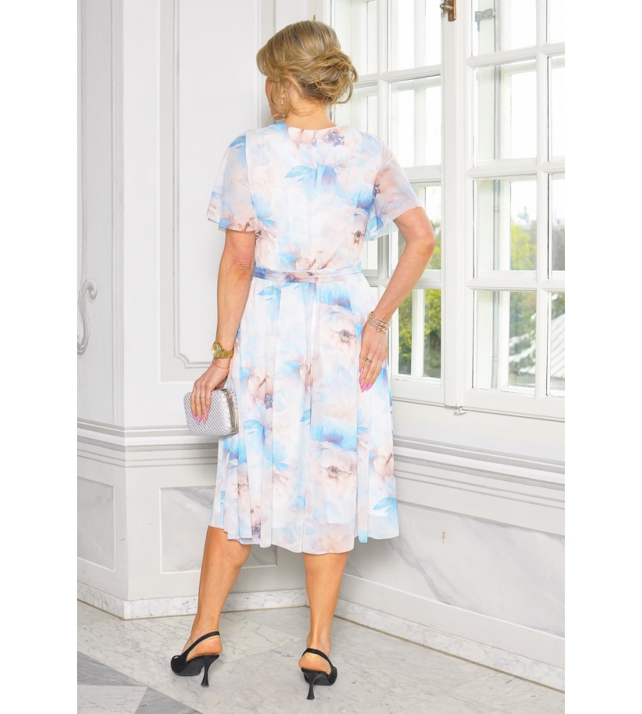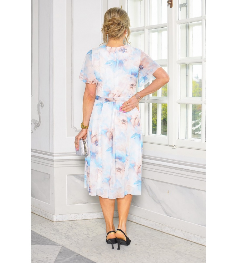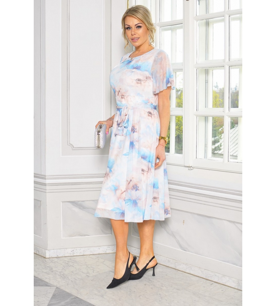 Zachwycająca, kobieca sukienka midi o rozkloszowanym kroju, która łączy elegancję z romantycznym urokiem. Wykonana z lekkiego, przewiewnego materiału w klasycznej bieli, ozdobiona delikatnym kwiatowym printem w odcieniach niebieskiego i beżu. Pięknie podkreśla sylwetkę dzięki dołączonemu paskowi w talii, który dodaje całości lekkości i harmonii.