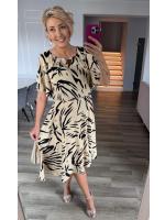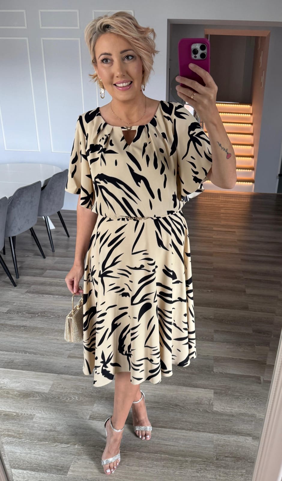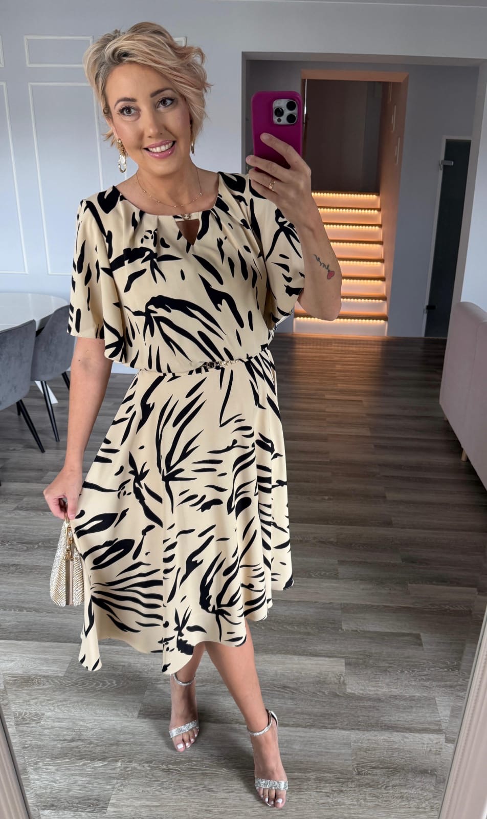 Stylowa sukienka midi o rozkloszowanym kroju przyciąga wzrok oryginalnym wzorem przypominającym zebrę w stonowanej palecie beżu i czerni. To idealne połączenie klasyki i modowego pazura. Lekko dopasowana góra podkreśla talię, a rozszerzany dół dodaje sylwetce lekkości i swobody. Sukienka świetnie sprawdzi się zarówno na co dzień, jak i na bardziej eleganckie wyjścia – wystarczy dobrać odpowiednie dodatki.
