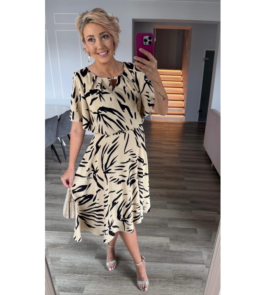 Rozkloszowana Sukienka Midi we Wzór à la Zebra – Beżowo-Czarna Klasyka z Charakterem