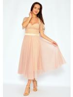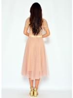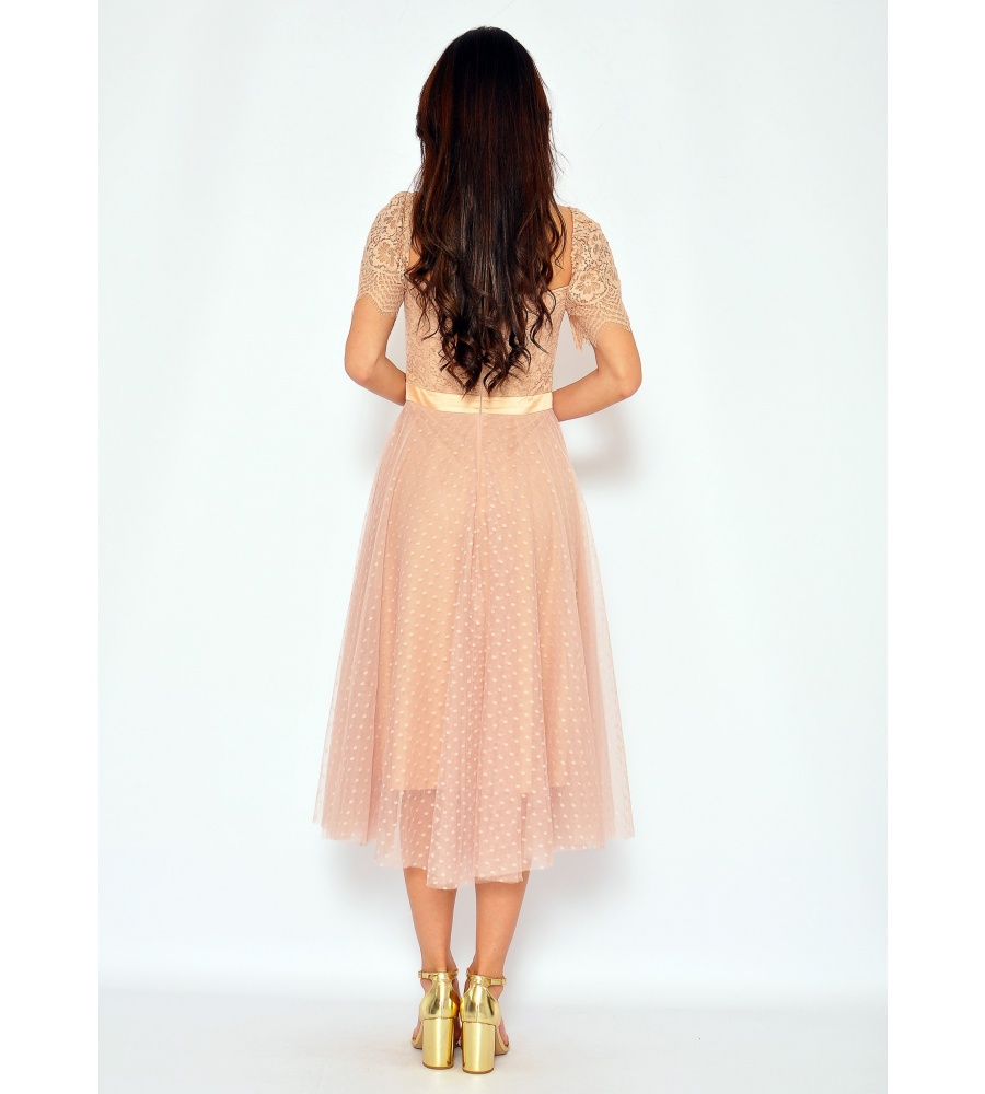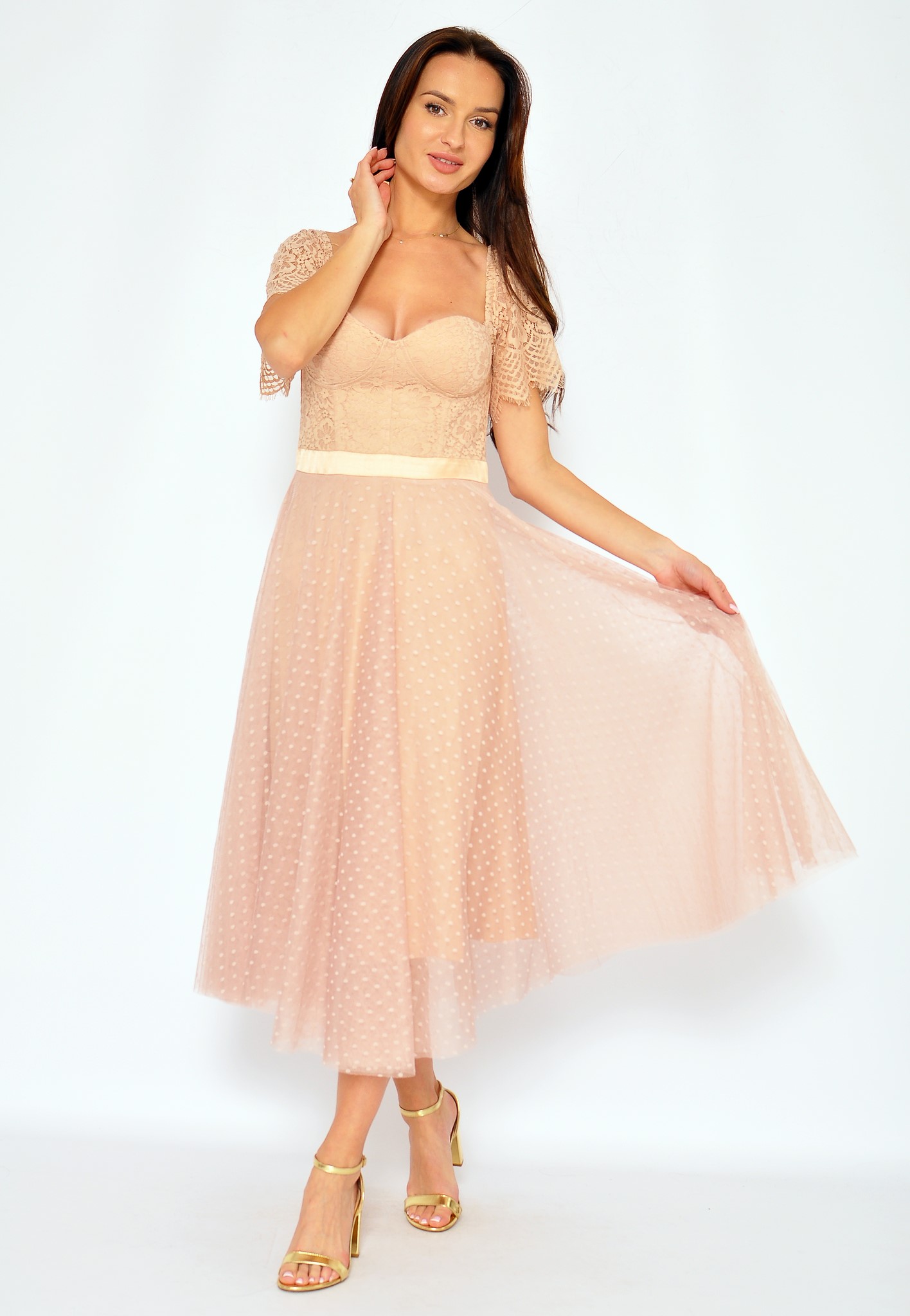 Tiulowa hiszpanka typu midi, z akcentem w postaci delikatnych groszków. Sukienka ma koronkową górę, zapina się z tyłu na kryty zamek. Idealna na wesela a także na inne wyjątkowe okazje. Pięknie prezentuje się ze szpilkami i kopertówką.