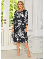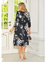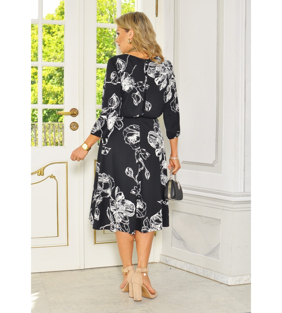 Stylowa i kobieca sukienka midi, wykonana z przyjemnego w dotyku materiału w klasycznym czarnym kolorze, ozdobiona delikatnym, białym kwiatowym wzorem. Model posiada elegancki rękawek 3/4, który subtelnie eksponuje nadgarstki, dodając całości lekkości. Talia została podkreślona dekoracyjnym złotym łańcuszkiem, który nadaje sylwetce proporcji i nutę szyku. Doskonała propozycja zarówno na co dzień, jak i na bardziej wyjątkowe okazje.