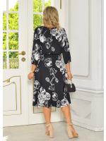Sukienka midi w kolorze czarnym z białym kwiatowym wzorem, rękaw 3/4, złoty łańcuszek w talii