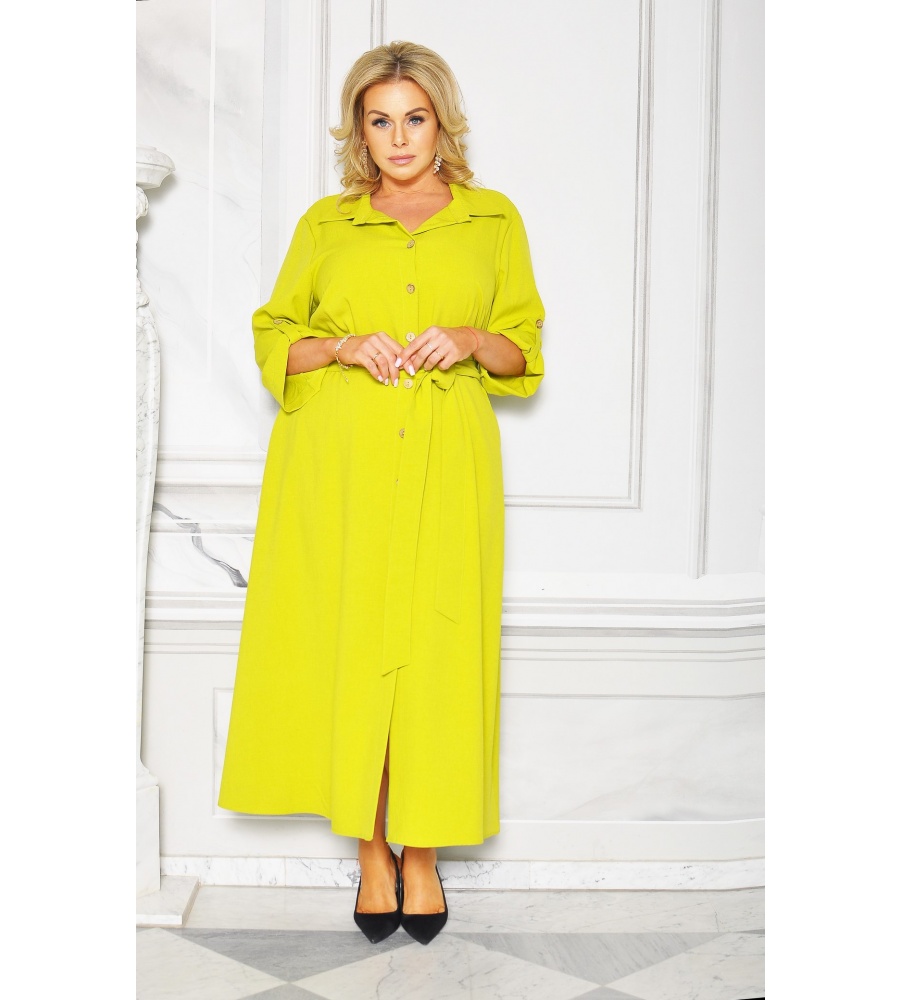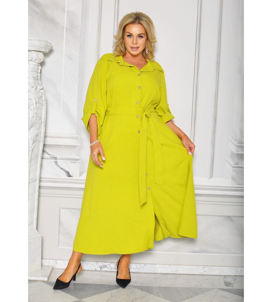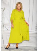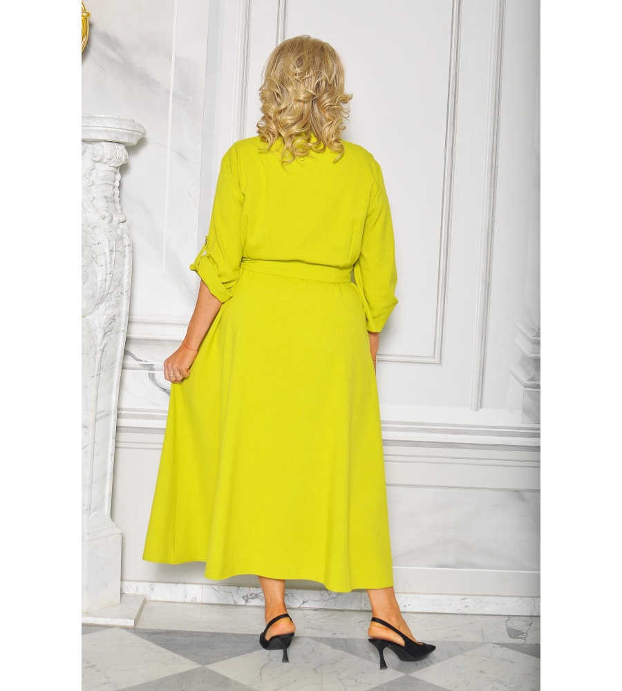 Kobieca rozkloszowana sukienka o długości midi w kolorze limonkowym i rękawem 7/8. Góra jest dopasowana, dlatego w skuteczny sposób wysmukli i podkreśli Twoją sylwetkę. A pasek w talii ją uwidoczni. Rozkloszowany dół sprawia, że sukienka staje się lekka. Model posiada praktyczne kieszenie, materiał jest lekki muślinowy.