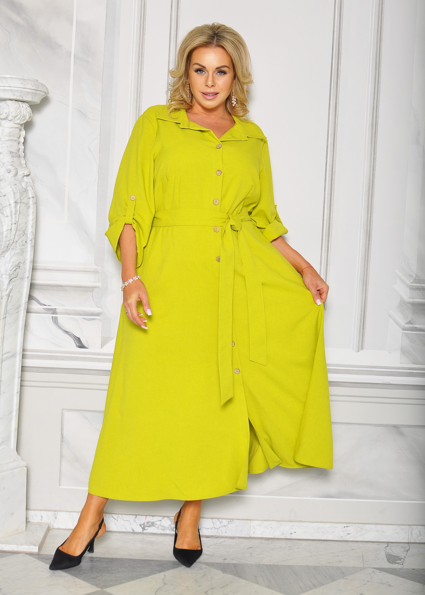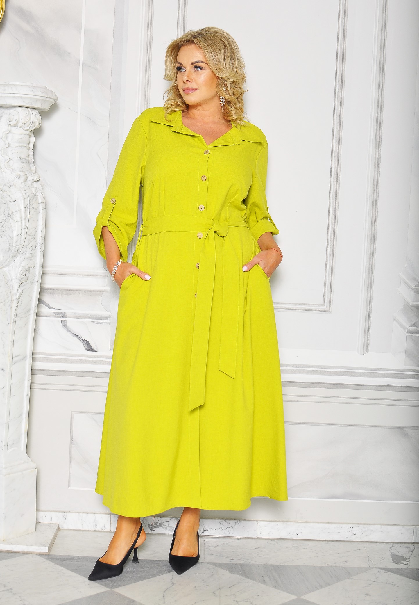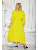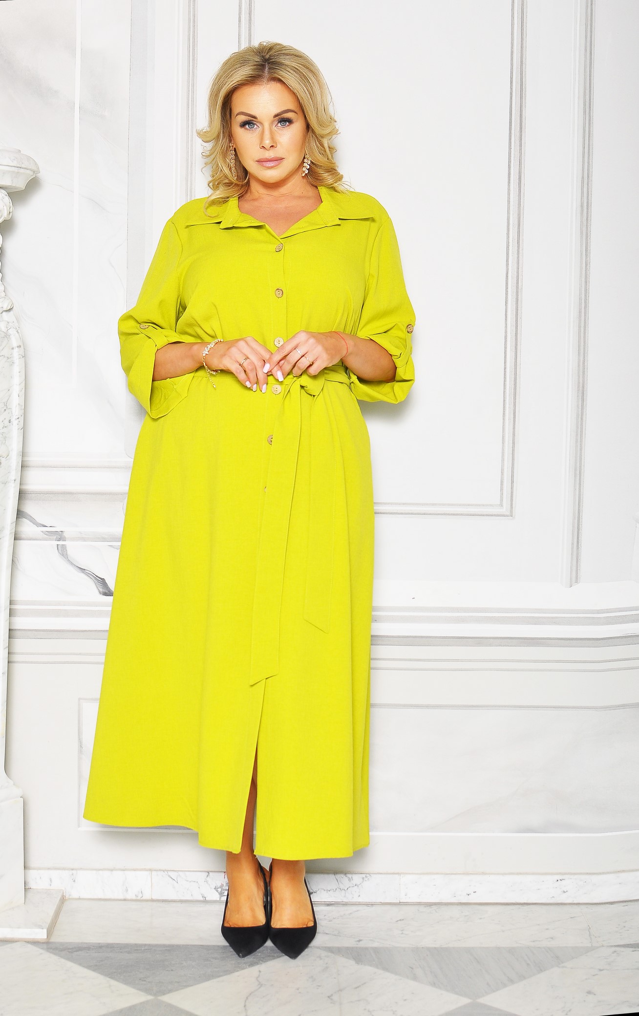 Kobieca rozkloszowana sukienka o długości midi w kolorze limonkowym i rękawem 7/8. Góra jest dopasowana, dlatego w skuteczny sposób wysmukli i podkreśli Twoją sylwetkę. A pasek w talii ją uwidoczni. Rozkloszowany dół sprawia, że sukienka staje się lekka. Model posiada praktyczne kieszenie, materiał jest lekki muślinowy.