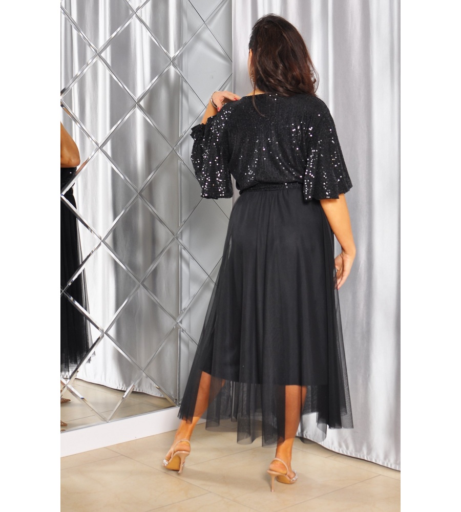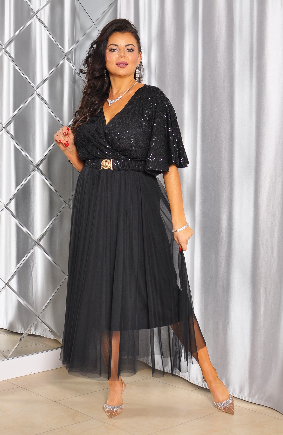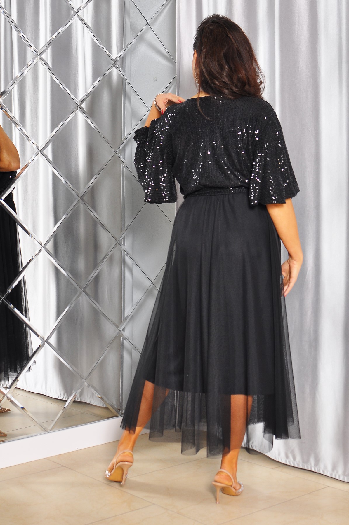 Stylowa i wyjątkowa sukienka o długości 7/8, która łączy lekkość tiulu z blaskiem czarnych cekinów.