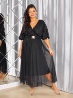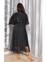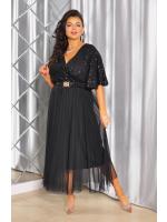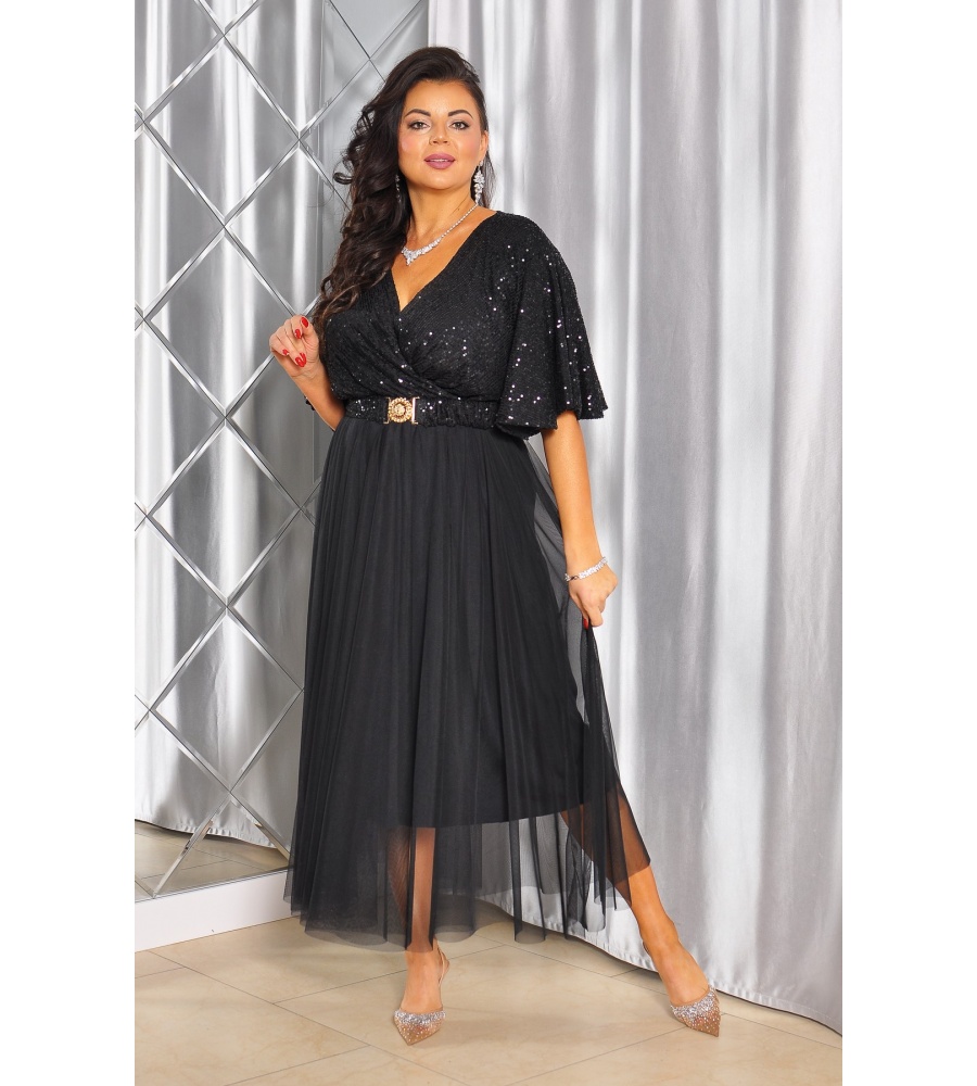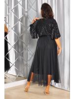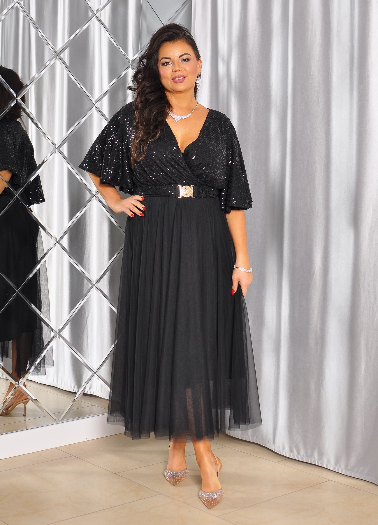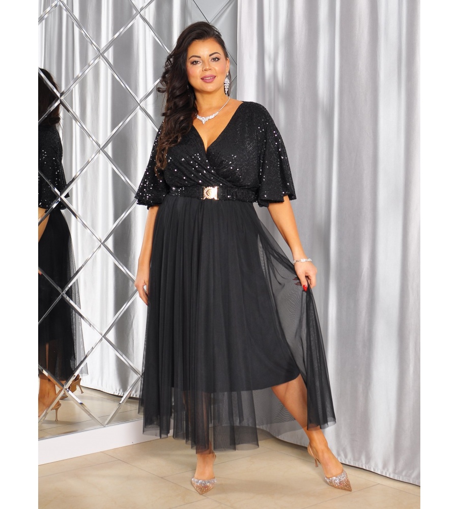 Stylowa i wyjątkowa sukienka o długości 7/8, która łączy lekkość tiulu z blaskiem czarnych cekinów.