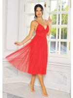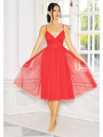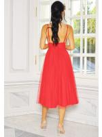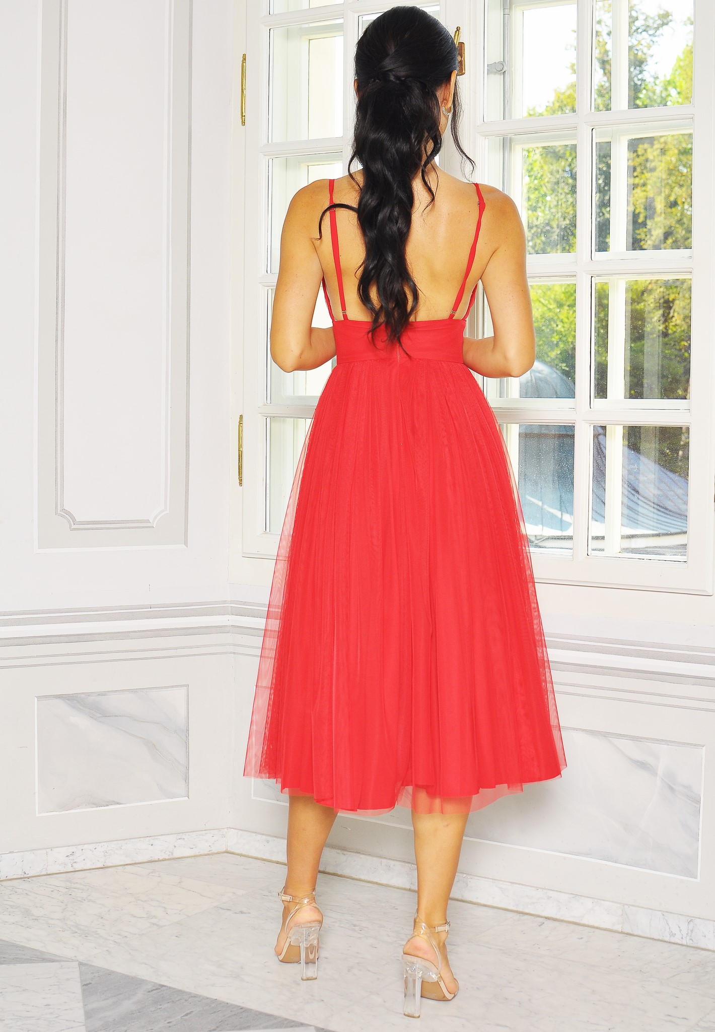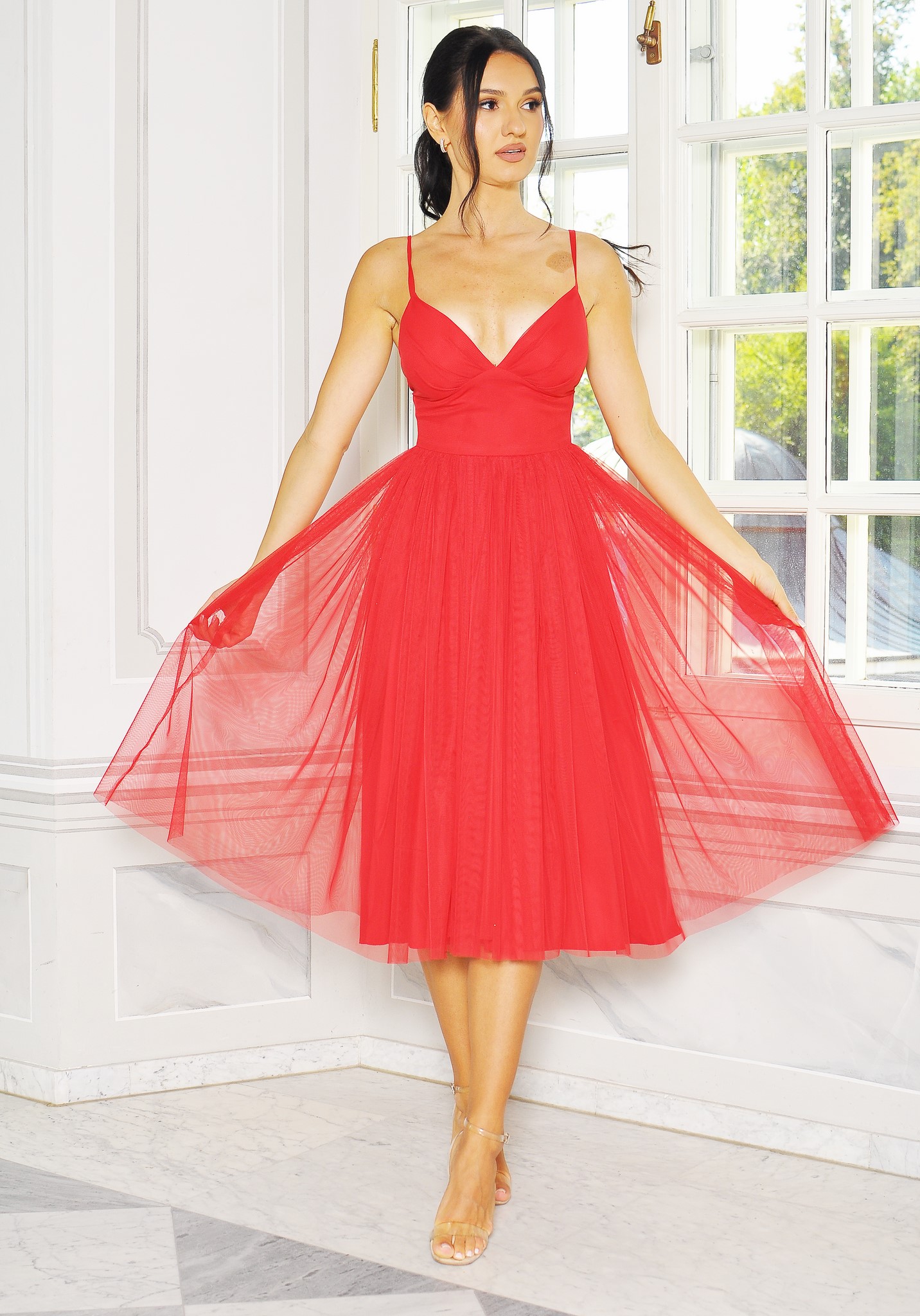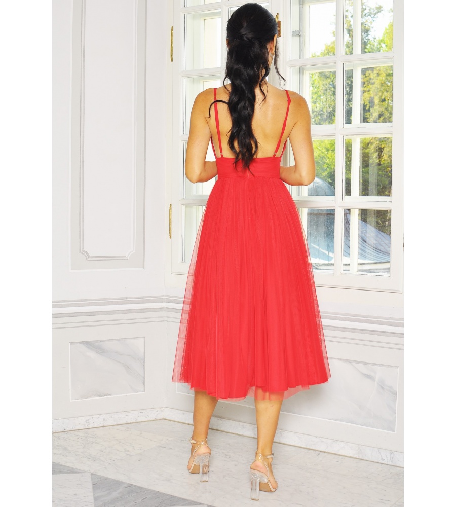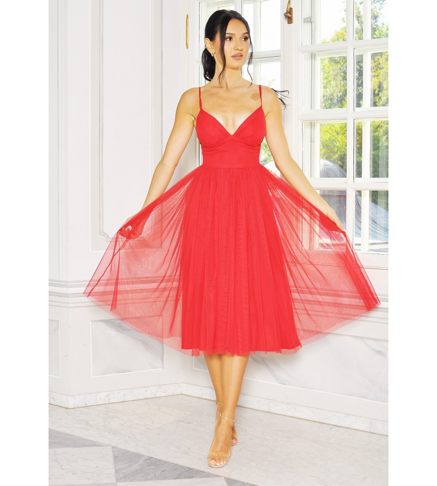 Sukienka midi w kolorze czerwonym na cienkich ramiączkach. Dekolt V świetnie podkreśli kobiece kształty, a tiulowy materiał nada unikatowego wyglądu całej stylizacji. Idealnie sprawdzi się na wszelkie wyjścia typu wesela, poprawiny itp.