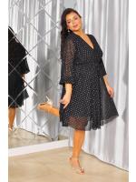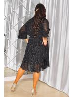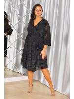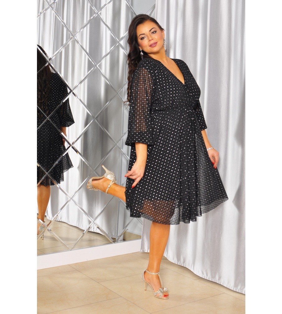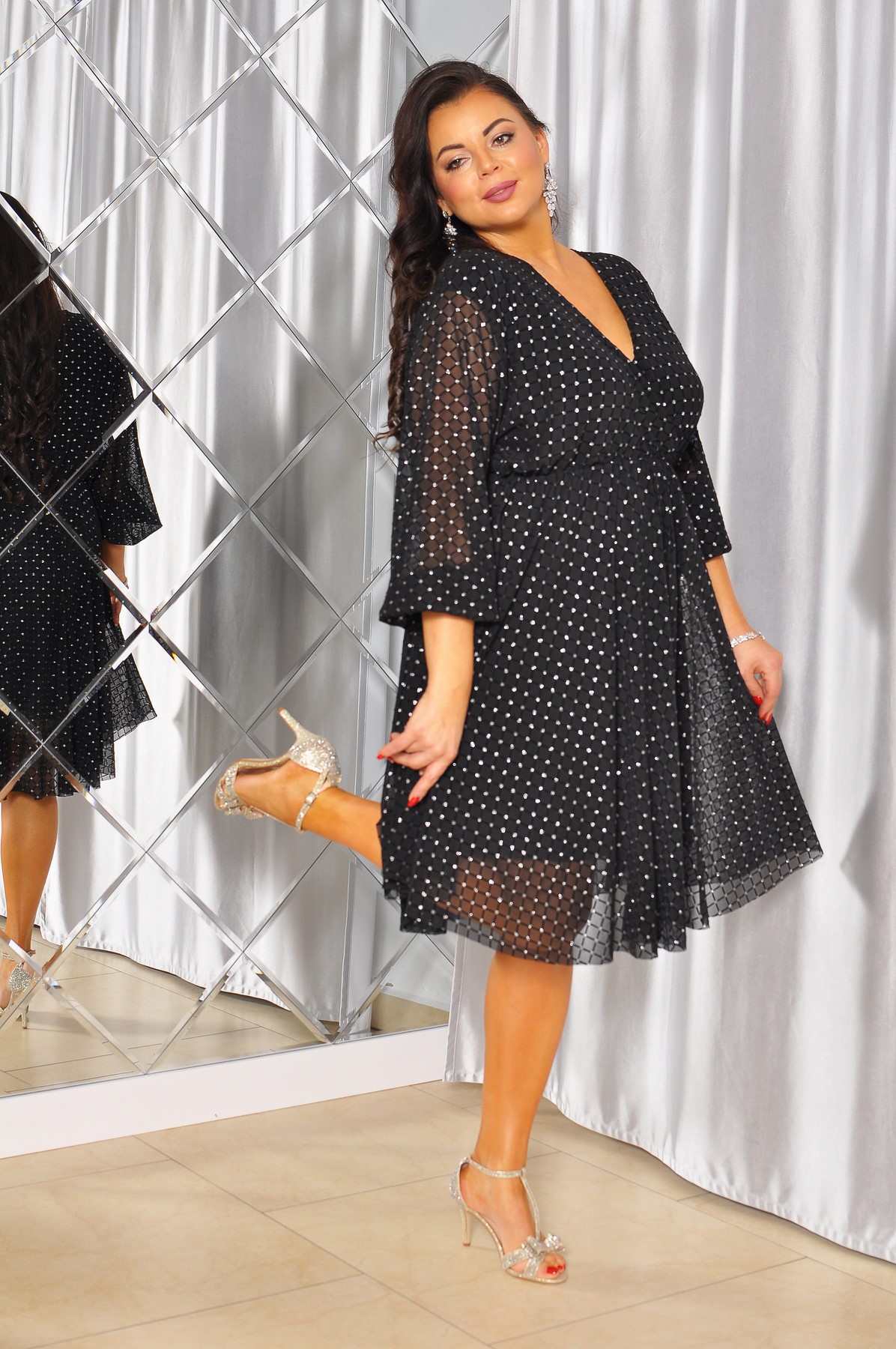Stylowa czarna sukienka o długości do kolan, zaprojektowana z myślą o sylwetkach plus size. Materiał został ozdobiony delikatnymi, srebrnymi kropeczkami, które dodają blasku i elegancji, jednocześnie nie przytłaczając całej stylizacji.