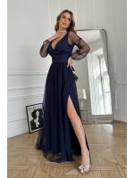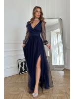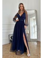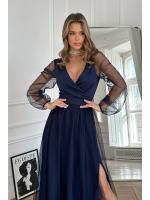 Wieczorowa sukienka uszyta została z lekkiej szyfonowej tkaniny, która wspaniale prezentuje się podczas ruchu. Góra sukienki dopasowana z delikatnym dekoltem, który w piękny sposób eksponuje biust oraz obojczyki. Sukienka maxi jest dopasowana w pasie, dzięki czemu podkreśla atuty figury.