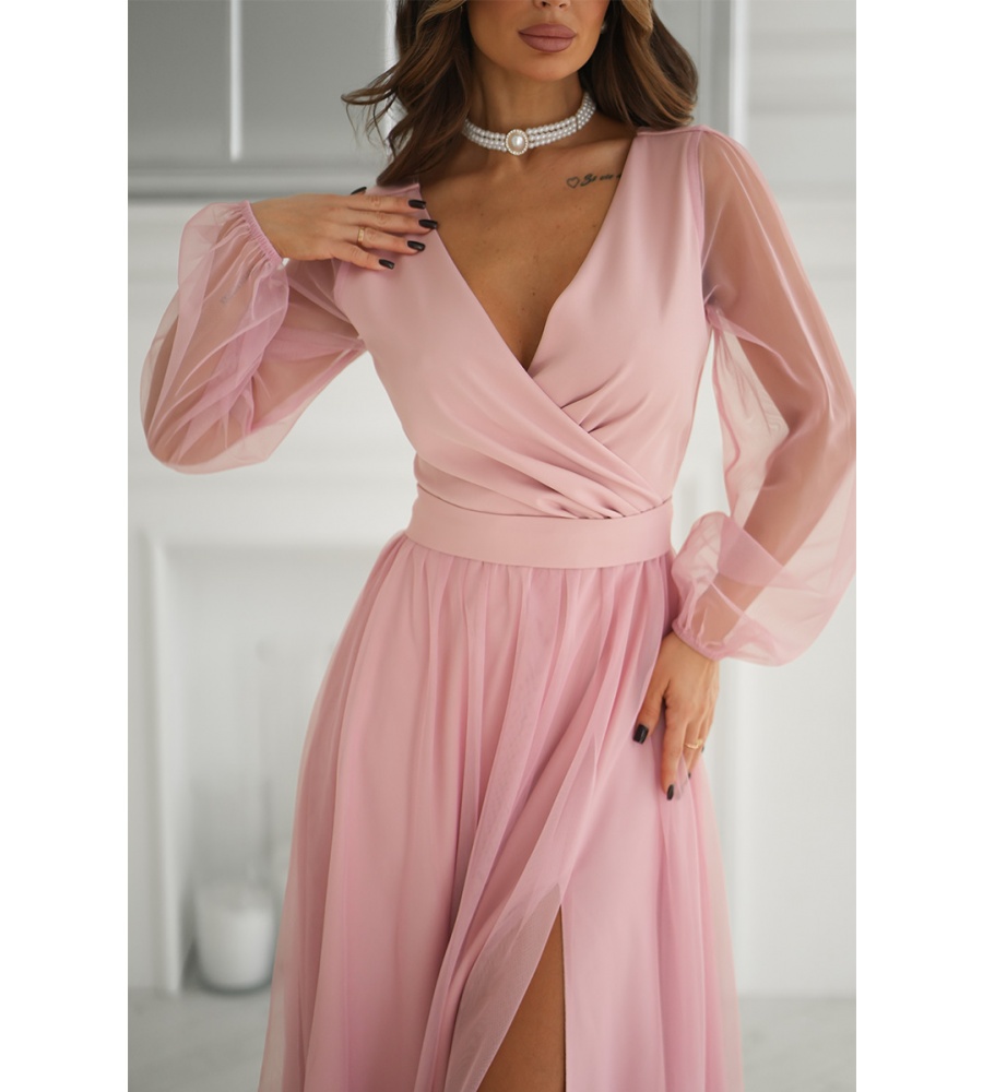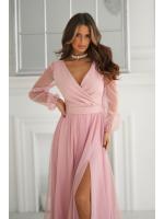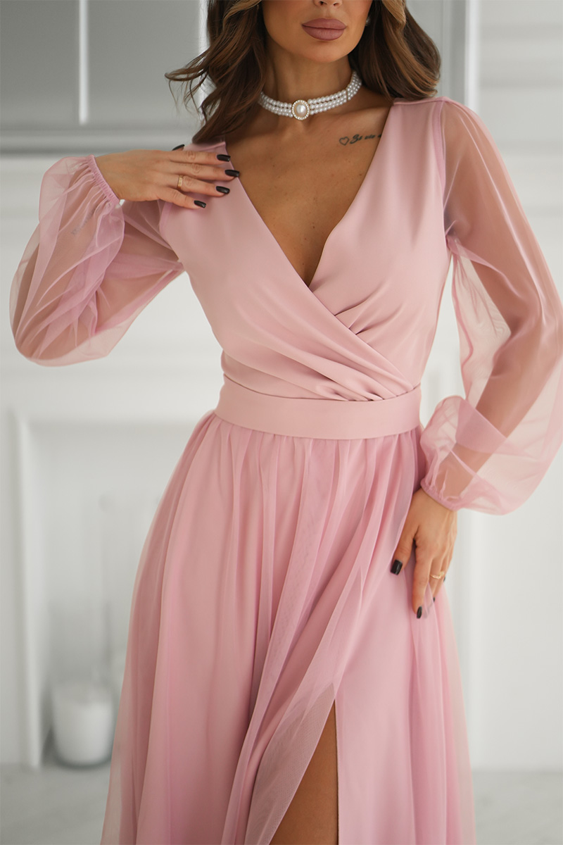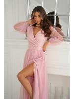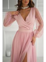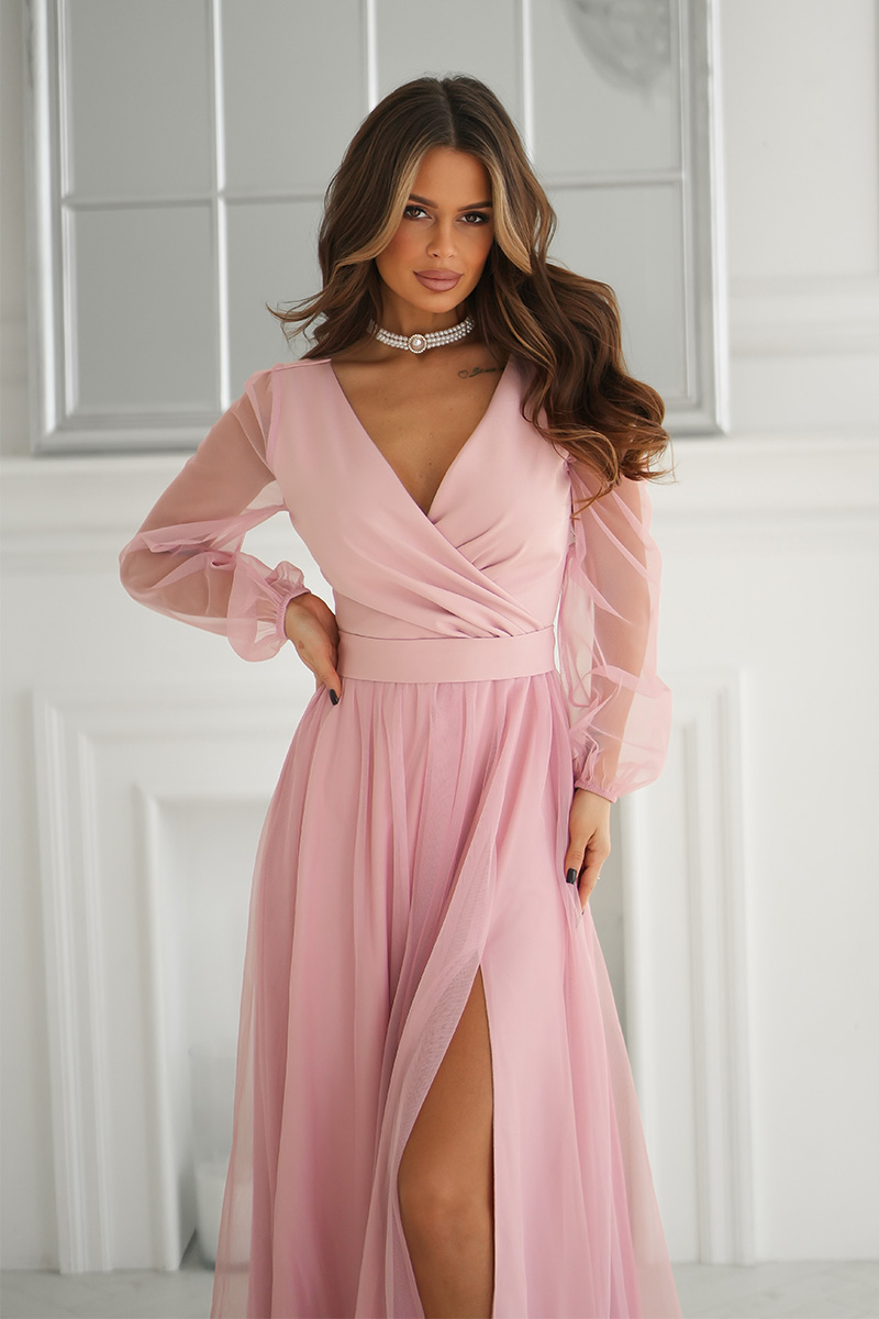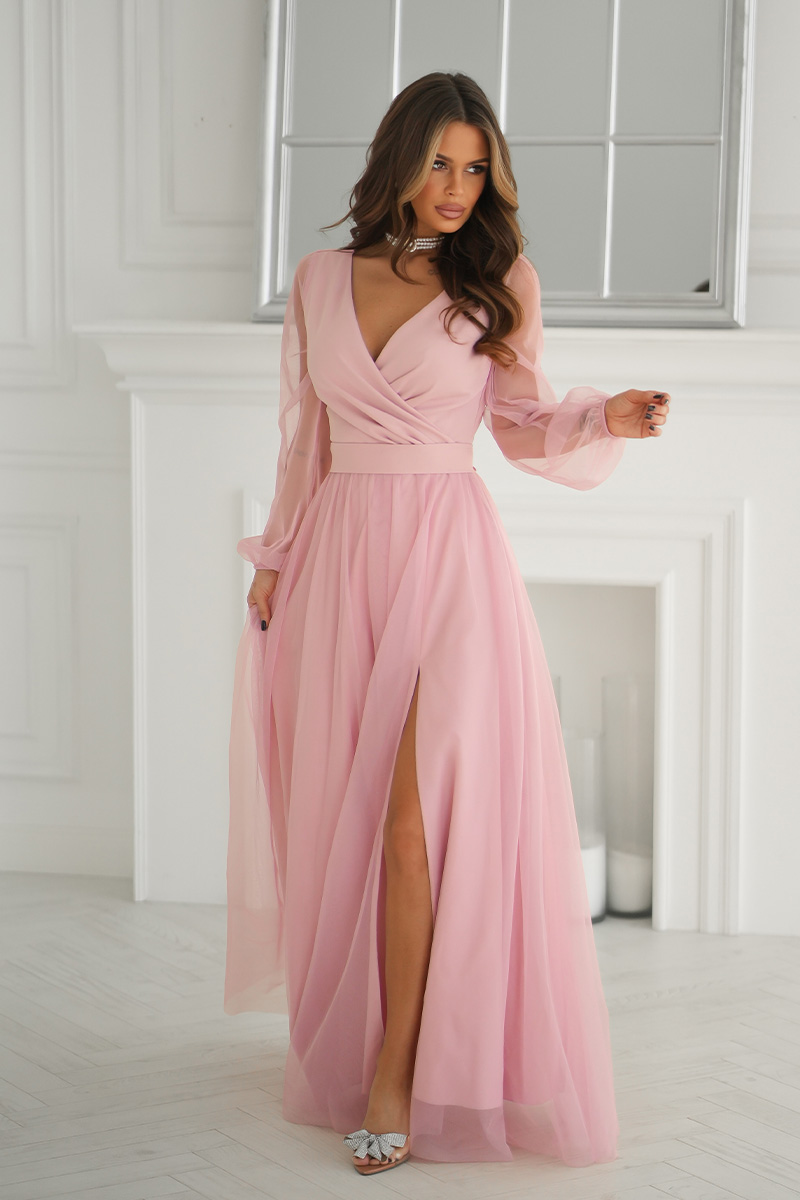 Wieczorowa sukienka uszyta została z lekkiej szyfonowej tkaniny, która wspaniale prezentuje się podczas ruchu. Góra sukienki dopasowana z delikatnym dekoltem, który w piękny sposób eksponuje biust oraz obojczyki. Sukienka maxi jest dopasowana w pasie, dzięki czemu podkreśla atuty figury.