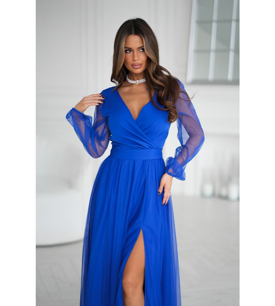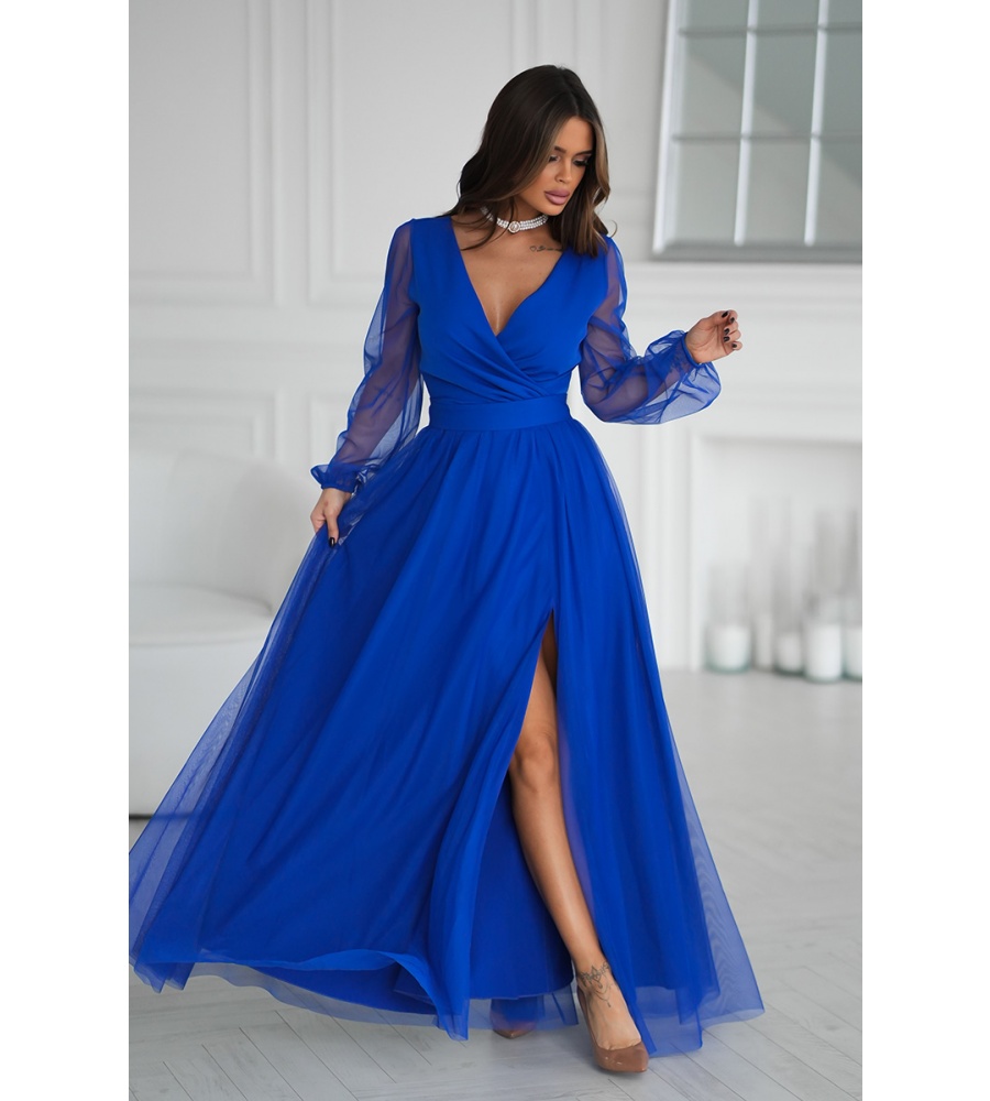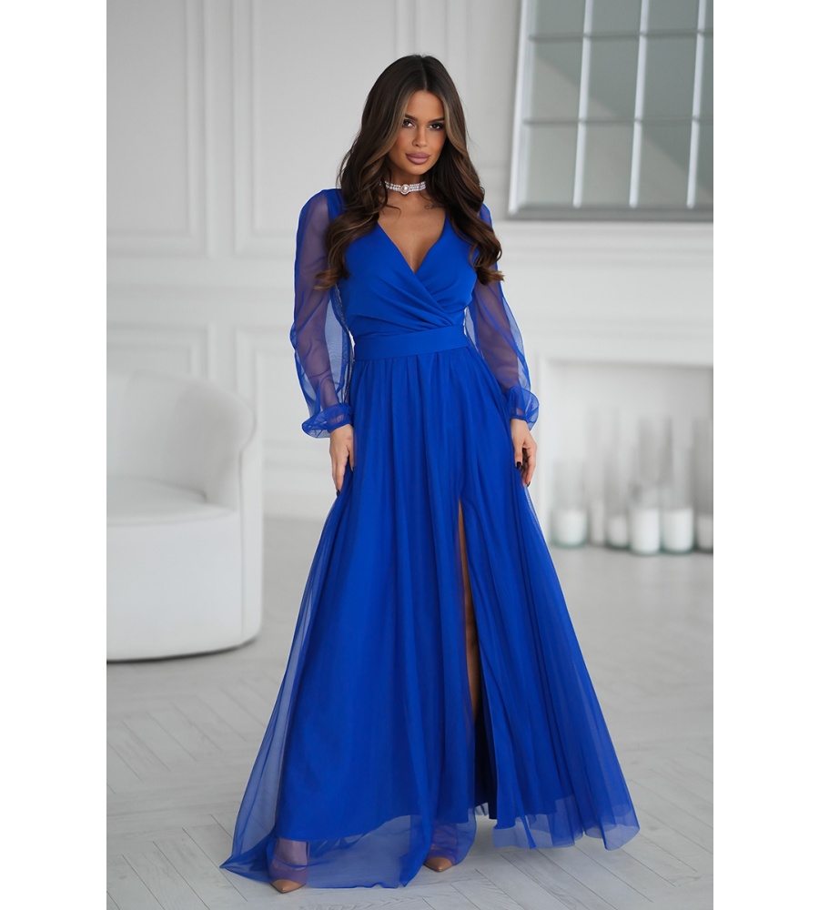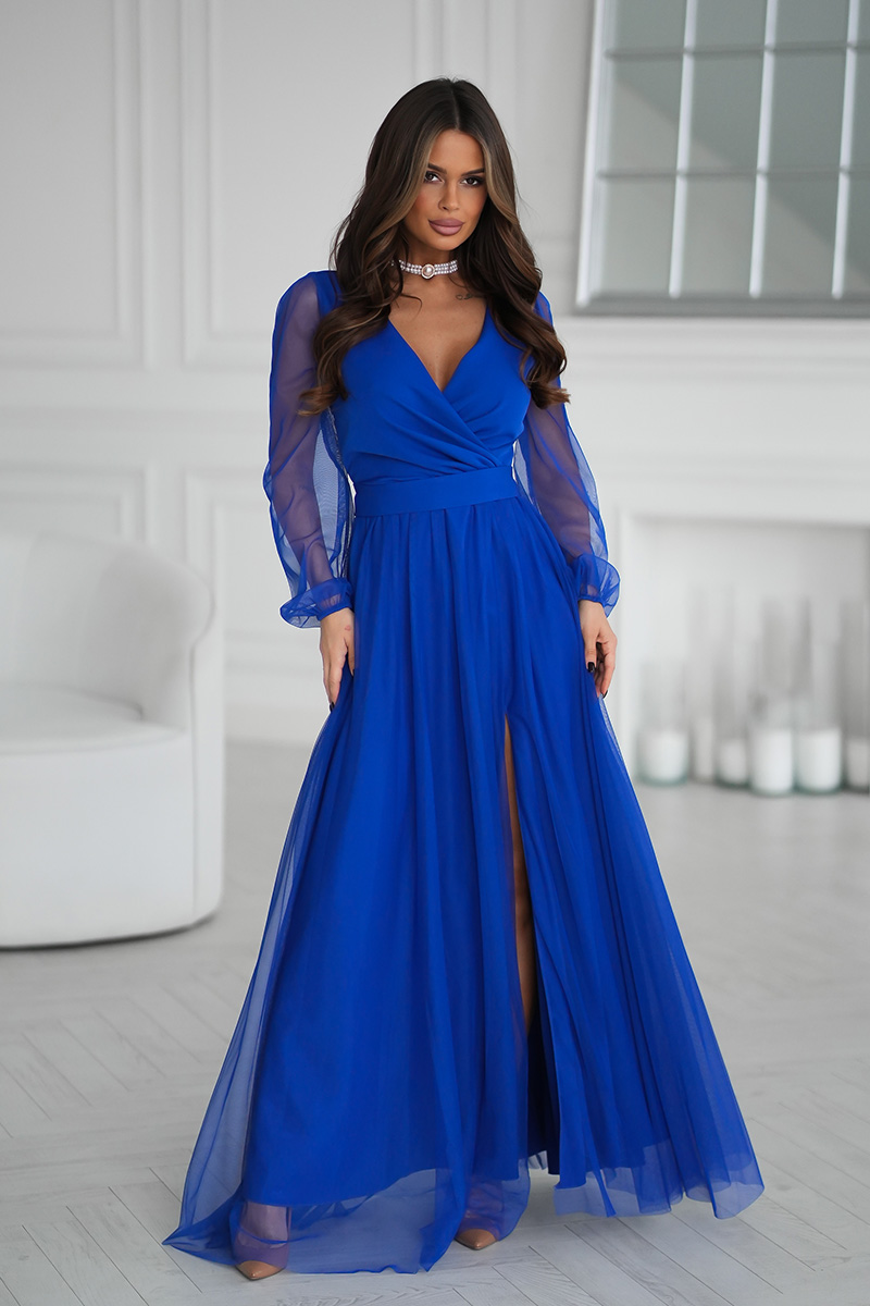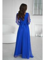 Wieczorowa sukienka uszyta została z lekkiej szyfonowej tkaniny, która wspaniale prezentuje się podczas ruchu. Góra sukienki dopasowana z delikatnym dekoltem, który w piękny sposób eksponuje biust oraz obojczyki. Sukienka maxi jest dopasowana w pasie, dzięki czemu podkreśla atuty figury.