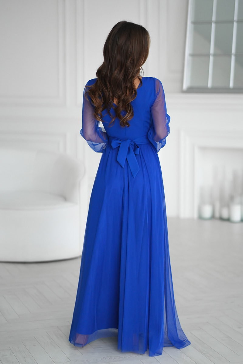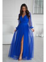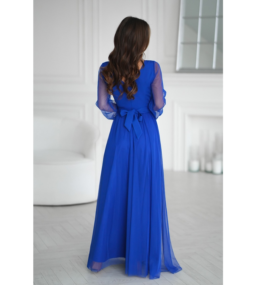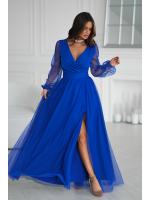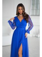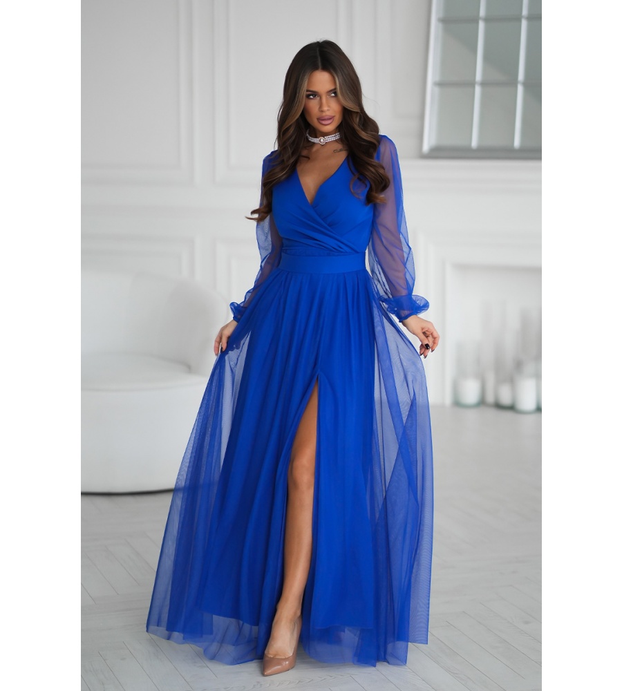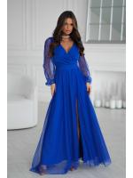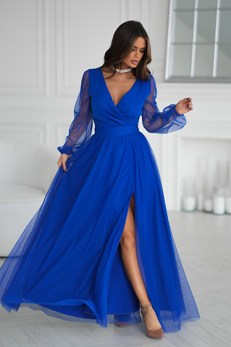 Wieczorowa sukienka uszyta została z lekkiej szyfonowej tkaniny, która wspaniale prezentuje się podczas ruchu. Góra sukienki dopasowana z delikatnym dekoltem, który w piękny sposób eksponuje biust oraz obojczyki. Sukienka maxi jest dopasowana w pasie, dzięki czemu podkreśla atuty figury.