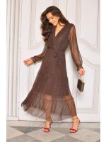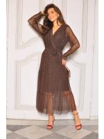 Stylowa i kobieca sukienka o długości 7/8, która zachwyca subtelnym blaskiem i klasycznym krojem. Wykonana z tkaniny pokrytej delikatnym brokatem, pięknie mieni się w świetle, dodając elegancji i szyku.